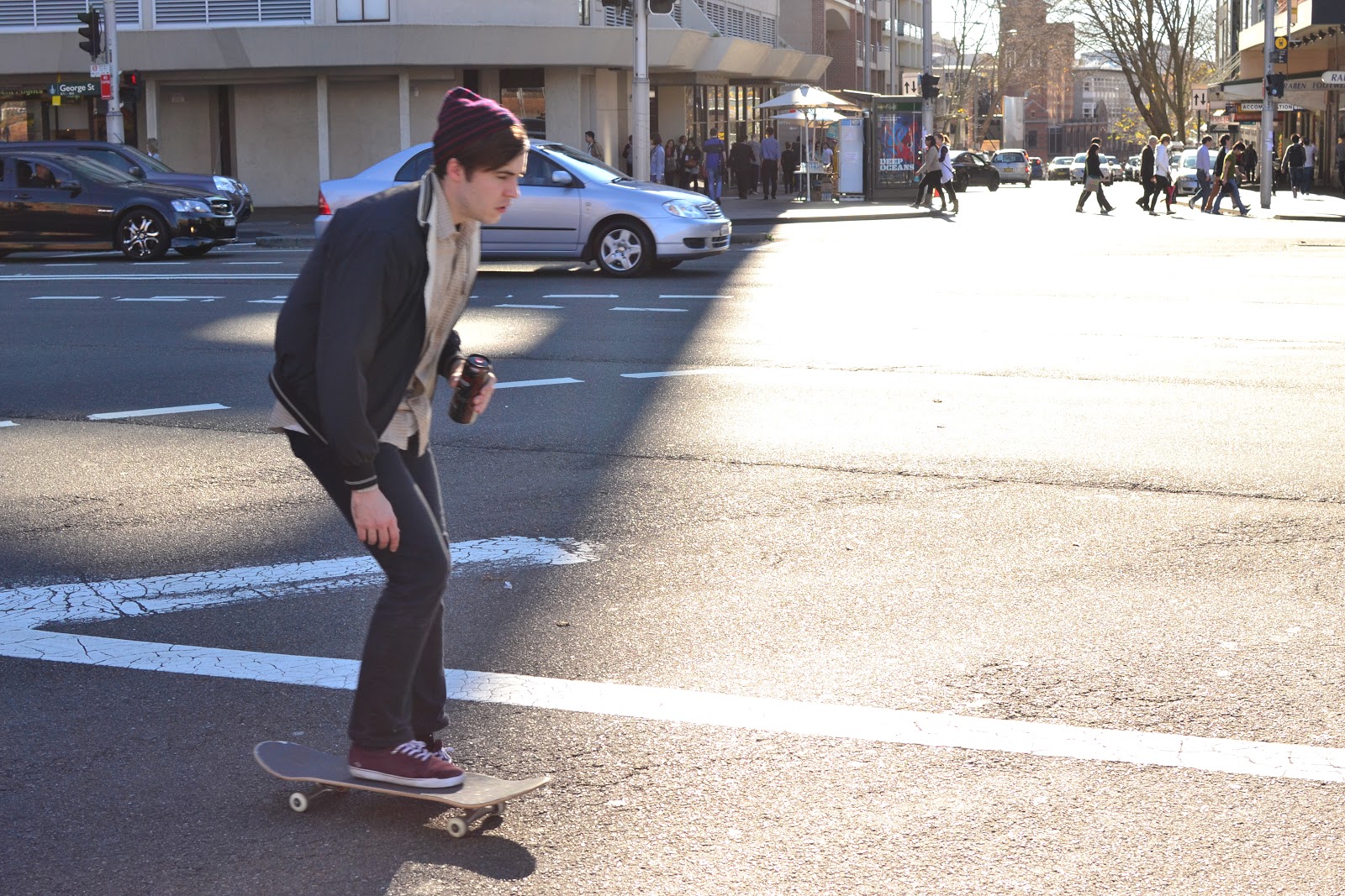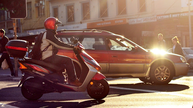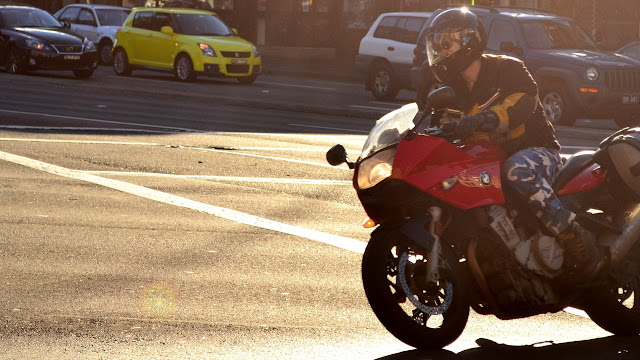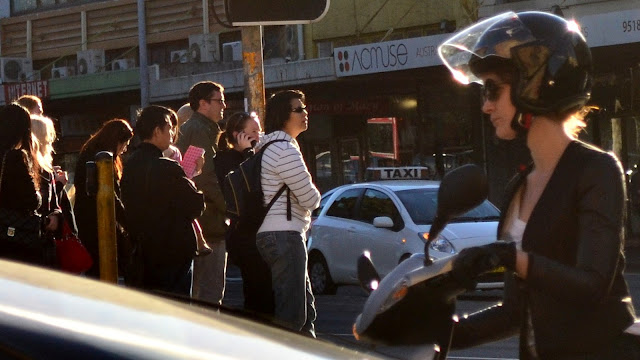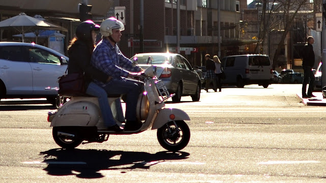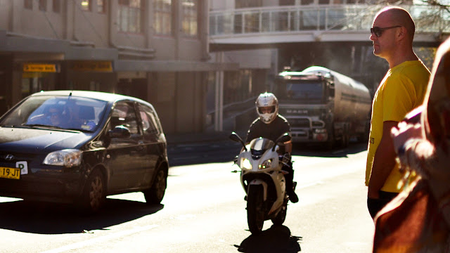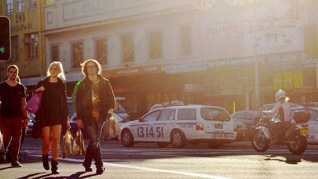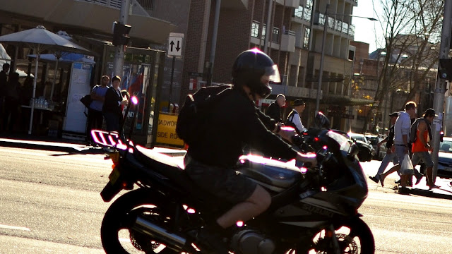On Saturday I tried a new meetup group, street photography organized by Nathan Harmond. We met at Central station, in the park opposite. Quite a number of people turned up. The mission was to go into the streets of Sydney and shoot anything interesting of course. We initially split up into 2 groups of about a dozen each, but I opted to split further into a group of one. My subject started with pedestrians, then cool kids, cyclists, and scooters. My settings of choice were a few major intersections, thinking that if you wait long enough then something weird will happen every now and again. I finished at the corner of Broadway and City Road Chippendale with a low late afternoon sun.