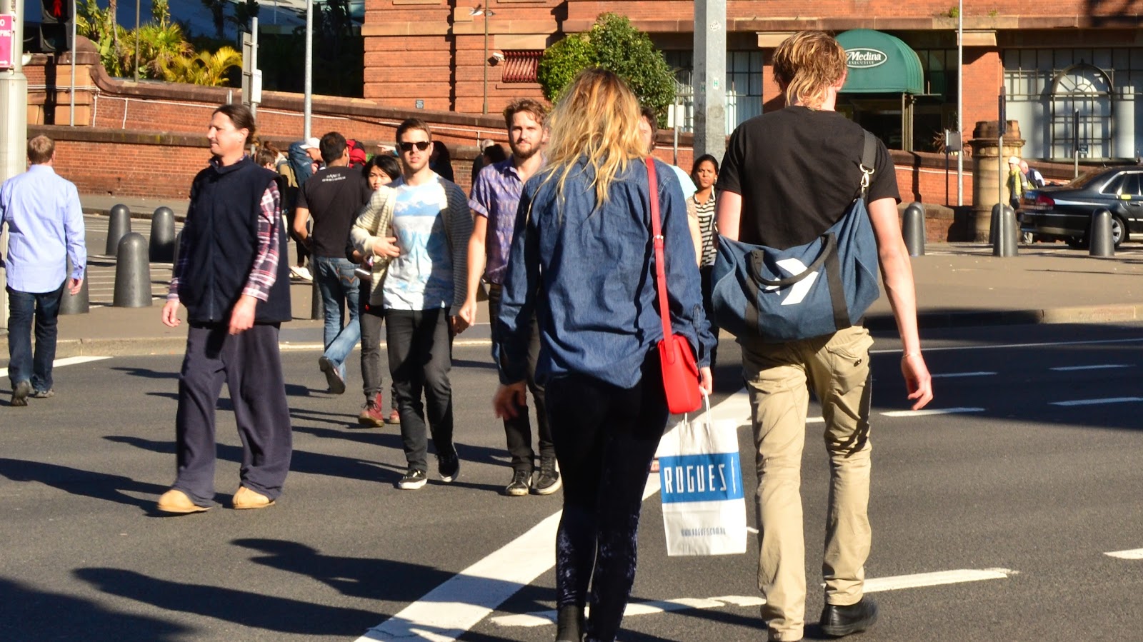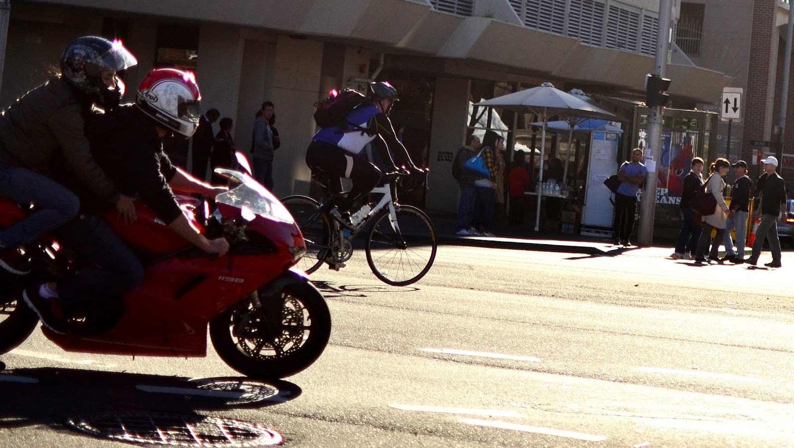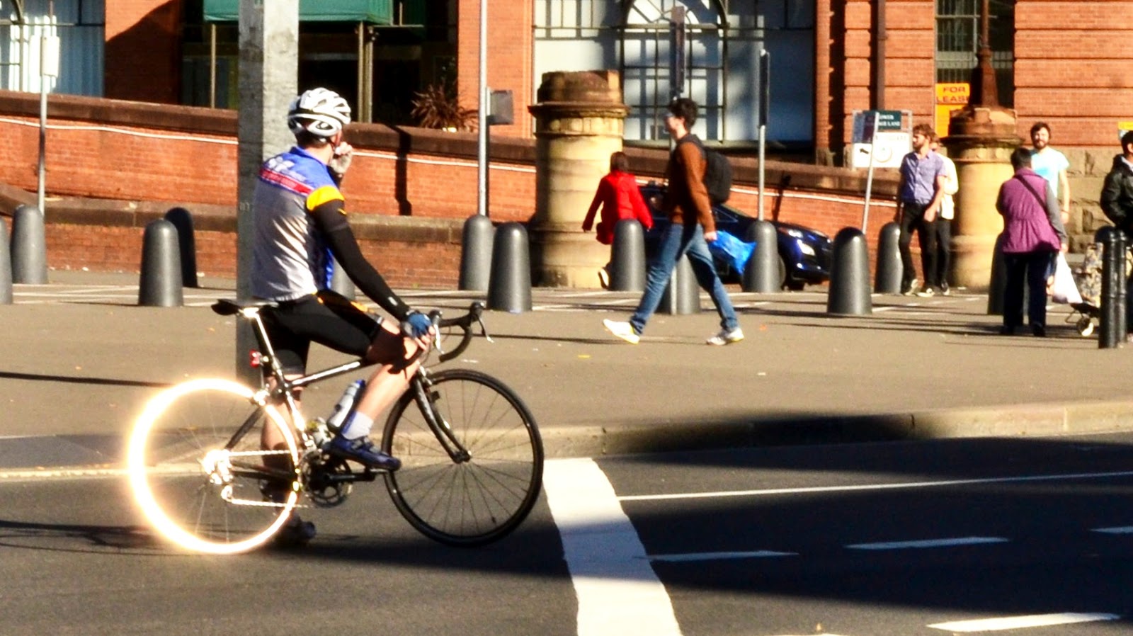 On Saturday I tried a new meetup group, street photography organized by Nathan Harmond. We met at Central station, in the park opposite. Quite a number of people turned up. The mission was to go into the streets of Sydney and shoot anything interesting of course. We initially split up into 2 groups of about a dozen each, but I opted to split further into a group of one. My subject started with pedestrians, then cool kids, cyclists, and scooters. My settings of choice were a few major intersections, thinking that if you wait long enough then something weird will happen every now and again. I finished at the corner of Broadway and City Road Chippendale with a low late afternoon sun.