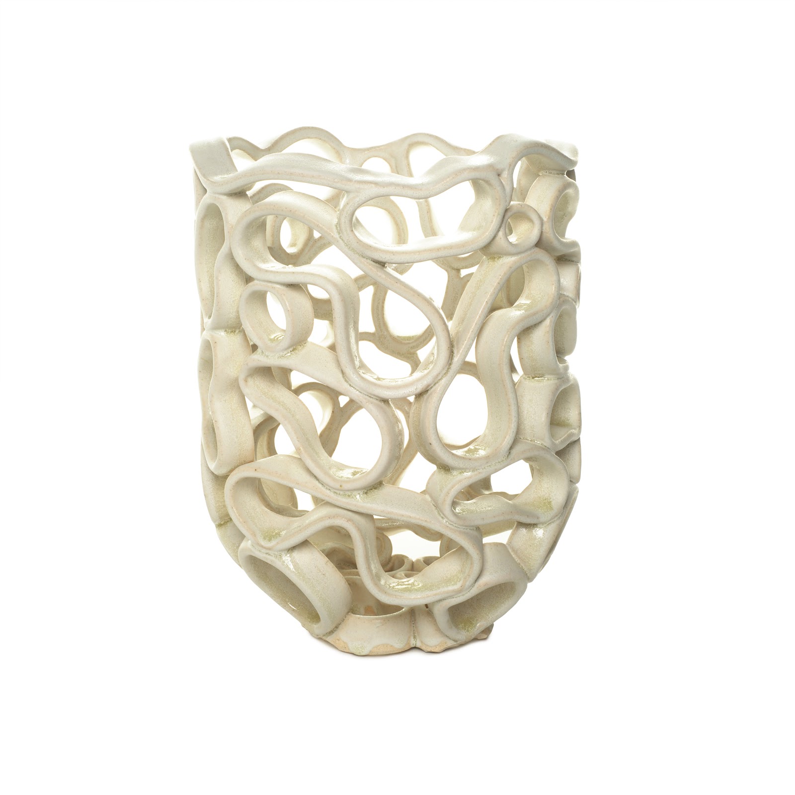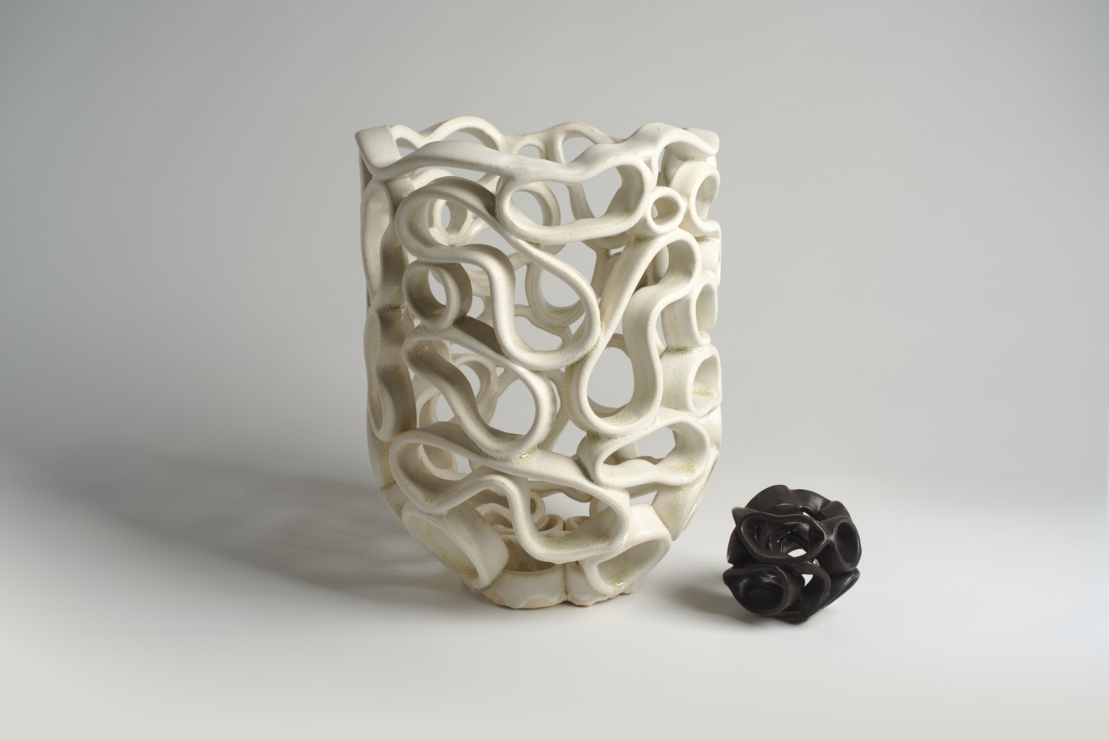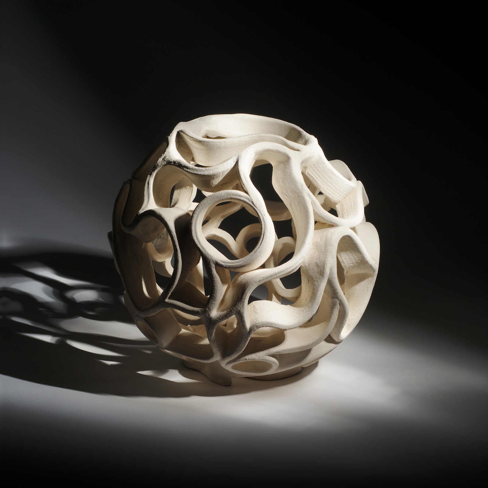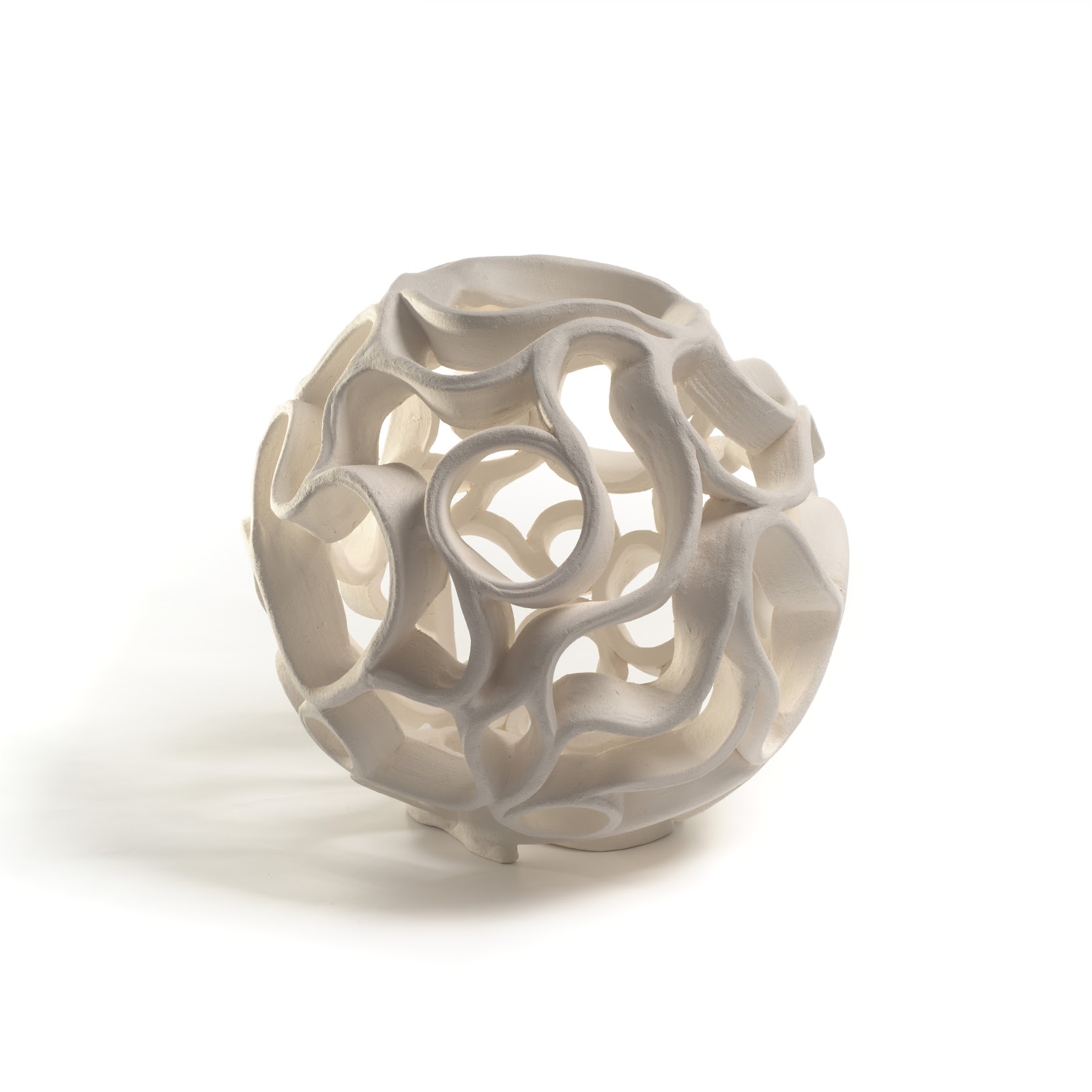 Since Leanne joined the studios, I have watch her produce her unique sculptures. However to this day I am still somewhat puzzled by her process. Intuitively you would expect the force of gravity to slump the cell-like loops, but the results show otherwise. The finished structures remind you of self reinforcing geodesic spheres, but also have an unmistakable organic character.