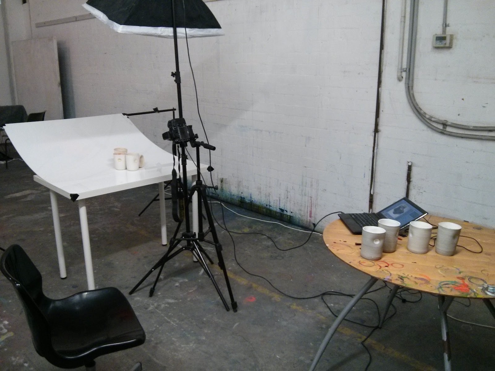 Rebecca asked me to shoot her box of ceramics work for her catalog. After a quick look and a wonder, I decided that consistency will work well with the cup sets. The jewelry was a bit more challenging and in need of more interpretive styling.Here are some setup shots. Also out of interest, most of the shoot was tethered.