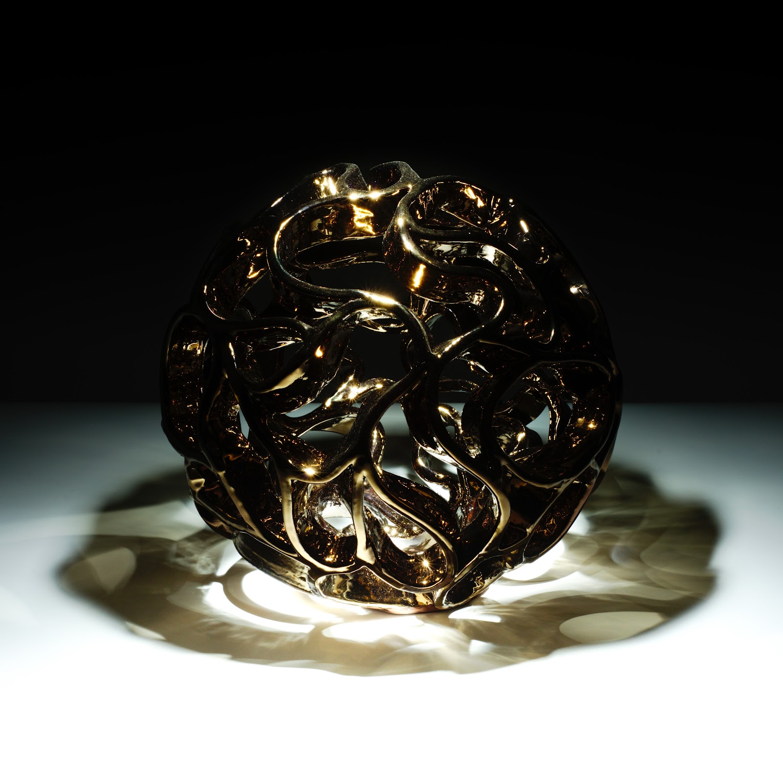 Here is the third installment of Leanne's ceramics work, the golden orb. What initially seemed like a straightforward photography request had taken much longer than expected. For reasons that I shall not get into now, suffice to say that learning occurred. By the end of the process I had come to idolize this mesmerizing object, and had to come up with a fitting designation -- The Promethean Attractor.